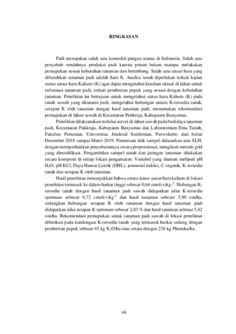 Padi merupakan salah satu komoditi pangan utama di Indonesia. Salah satu penyebab rendahnya produksi padi karena petani belum mampu melakukan pemupukan sesuai kebutuhan tanaman dan berimbang. Salah satu unsur hara yang dibutuhkan tanaman padi adalah hara K. Analisa tanah diperlukan terkait kajian status unsur hara Kalium (K) agar dapat mengetahui keadaan aktual di lahan untuk informasi tanaman padi, terkait pemberian pupuk yang sesuai dengan kebutuhan tanaman. Penelitian ini bertujuan untuk mengetahui status hara Kalium (K) pada tanah sawah yang ditanami padi, mengetahui hubungan antara K-tersedia tanah, serapan K oleh tanaman dengan hasil tanaman padi, menentukan rekomendasi pemupukan di lahan sawah di Kecamatan Patikraja, Kabupaten Banyumas. Penelitian dilaksanakan melalui survei di lahan sawah pada budidaya tanaman padi, Kecamatan Patikraja, Kabupaten Banyumas dan Laboratorium Ilmu Tanah, Fakultas Pertanian, Universitas Jenderal Soedirman, Purwokerto dari bulan Desember 2018 sampai Maret 2019. Penentuan titik sampel didasarkan atas SLH, dengan memperhatikan penyebarannya secara proporsional, mengikuti metode grid yang dimodifikasi. Pengambilan sampel tanah dan jaringan tanaman dilakukan secara komposit di setiap lokasi pengamatan. Variabel yang diamati meliputi pH H2O, pH KCl, Daya Hantar Listrik (DHL), potensial redoks, C-organik, K-tersedia tanah dan serapan K oleh tanaman. Hasil penelitian menunjukkan bahwa rerata status unsur hara kalium di lokasi penelitian termasuk ke dalam harkat tinggi sebesar 0,64 cmol(+)kg- . Hubungan Ktersedia tanah dengan hasil tanaman padi sawah didapatkan nilai K-tersedia optimum sebesar 0,72 cmol(+)kg 1 dan hasil tanaman sebesar 5,90 ton/ha, sedangkan hubungan serapan K oleh tanaman dengan hasil tanaman padi didapatkan nilai serapan K optimum sebesar 2,03 % dan hasil tanaman sebesar 5,42 ton/ha. Rekomendasi pemupukan untuk tanaman padi sawah di lokasi penelitian diberikan pada kandungan K-tersedia tanah yang termasuk harkat sedang dengan pemberian pupuk sebesar 65 kg K2O/ha atau setara dengan 236 kg Phonska/ha. -1